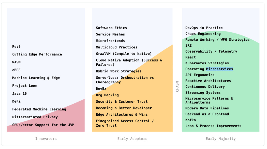 InfoQ’s editorial model is focused on producing content about technologies that are in the innovator, early adopter, and early majority stages of the technology adoption curve.